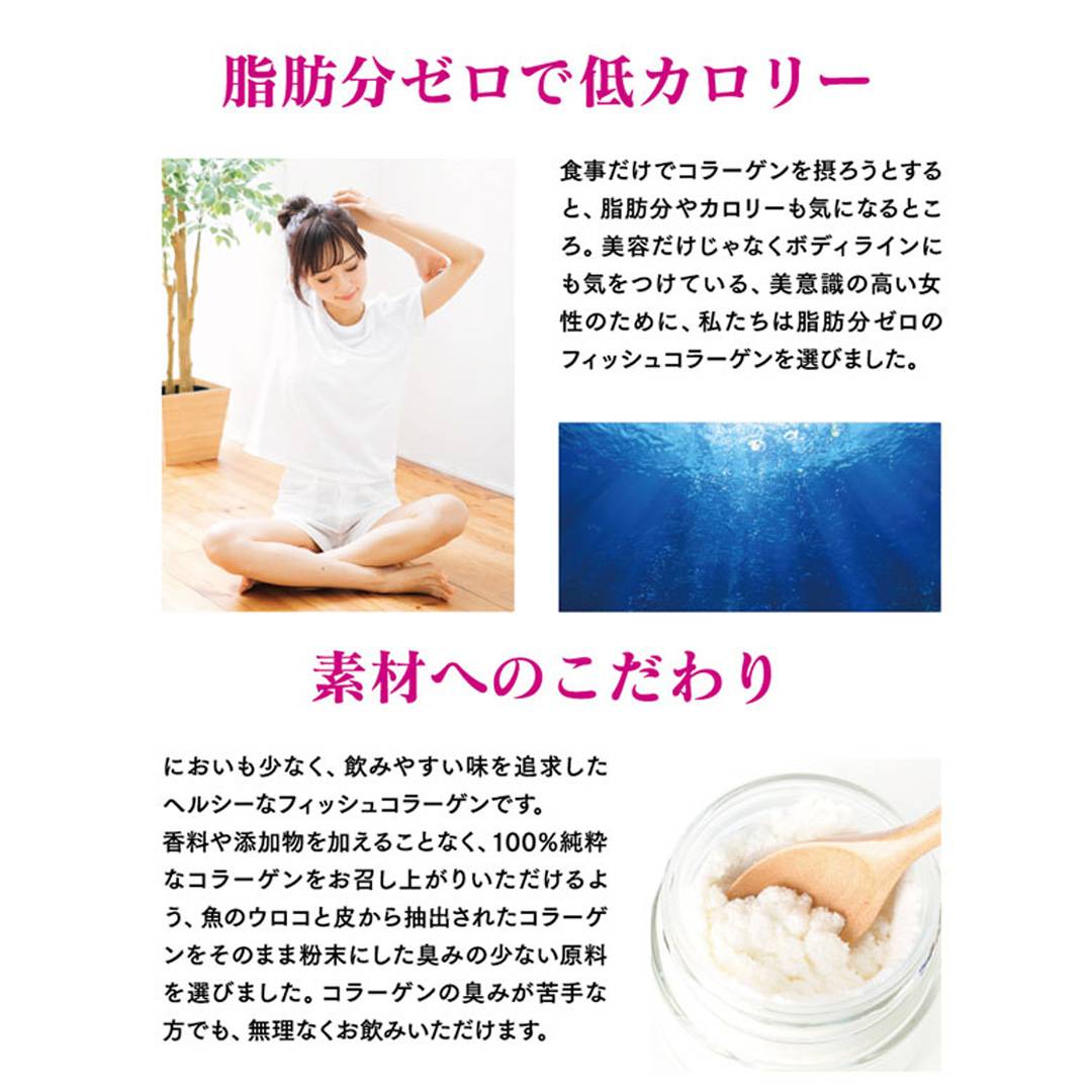 天然魚からとった100%まじりけのないフィッシュコラーゲンです。気になる味や匂いが少なく、低分子化して溶けやすいため、飲み物や料理に加えて毎日おいしくコラーゲンを補給できます。香料、着色料、保存料などの添加物は一切加えておりません。