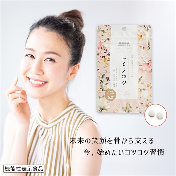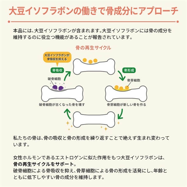 機能性表示:本品には大豆イソフラボンが含まれます。大豆イソフラボンには骨の成分を維持するのに役立つ機能があることが報告されています。本品には、リコペロサイドHが含まれます。