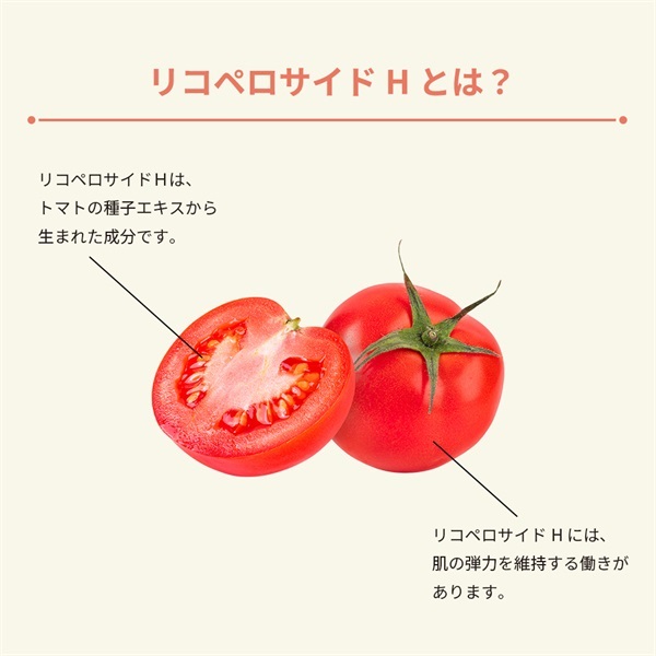 リコペロサイドHには、肌の弾力を維持し、肌の健康に役立つ機能があることが報告されています。