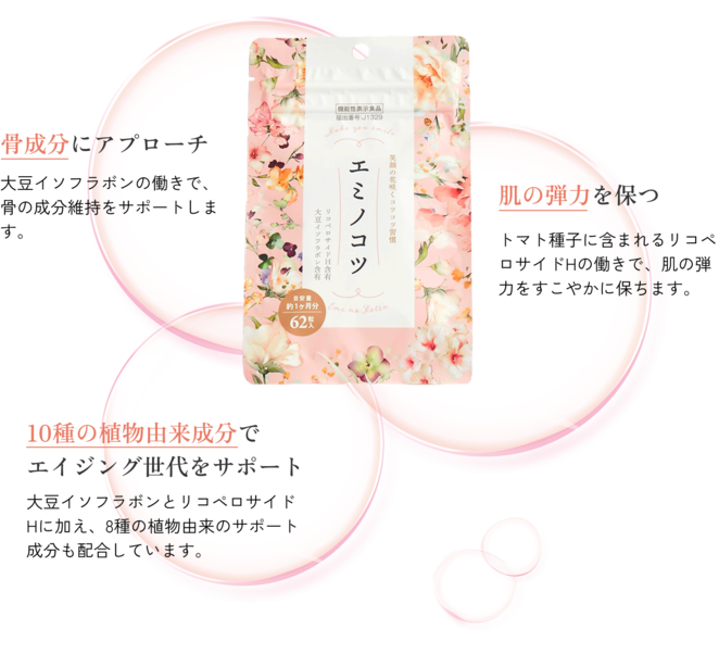 エミノコツは、骨と肌に着目した機能性表示食品のサプリメント。「骨の成分の維持」と「肌の弾力の維持」どちらにもアプローチしながら、いつまでもすこやかな毎日をおくれるよう大人女性をサポートします。