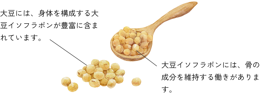 女性ホルモンであるエストロゲンに似た作用をもつ大豆イソフラボンは、骨の再生サイクルをサポート。破骨細胞による骨吸収を抑え、骨芽細胞による骨の形成を活発にし、年齢とともに低下しやすい骨の成分を維持します。