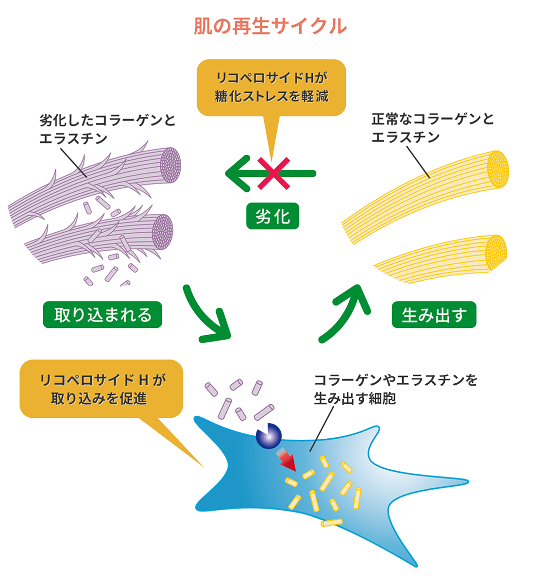 加齢にともない、肌を構成する正常なコラーゲンとエラスチンが減少し、反対に、質の悪い劣化したコラーゲンとエラスチンが増える傾向があります。リコペロサイドHは、肌の再生サイクルをすこやかに導くことで、正常なコラーゲンとエラスチンを増やし、肌のハリ・弾力の保持に力を発揮します。