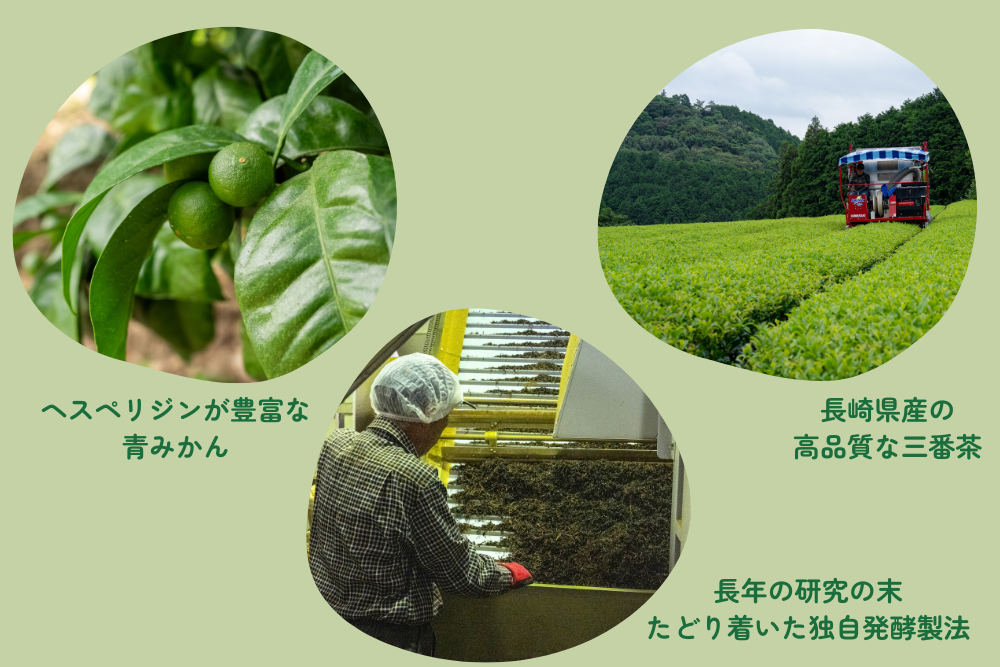 青みかん発酵茶は、長崎県産の青みかんと三番茶を独自製法で発酵させてつくった、ほんのり青みかんの風味が香るスッキリと飲みやすい味わいのお茶です。